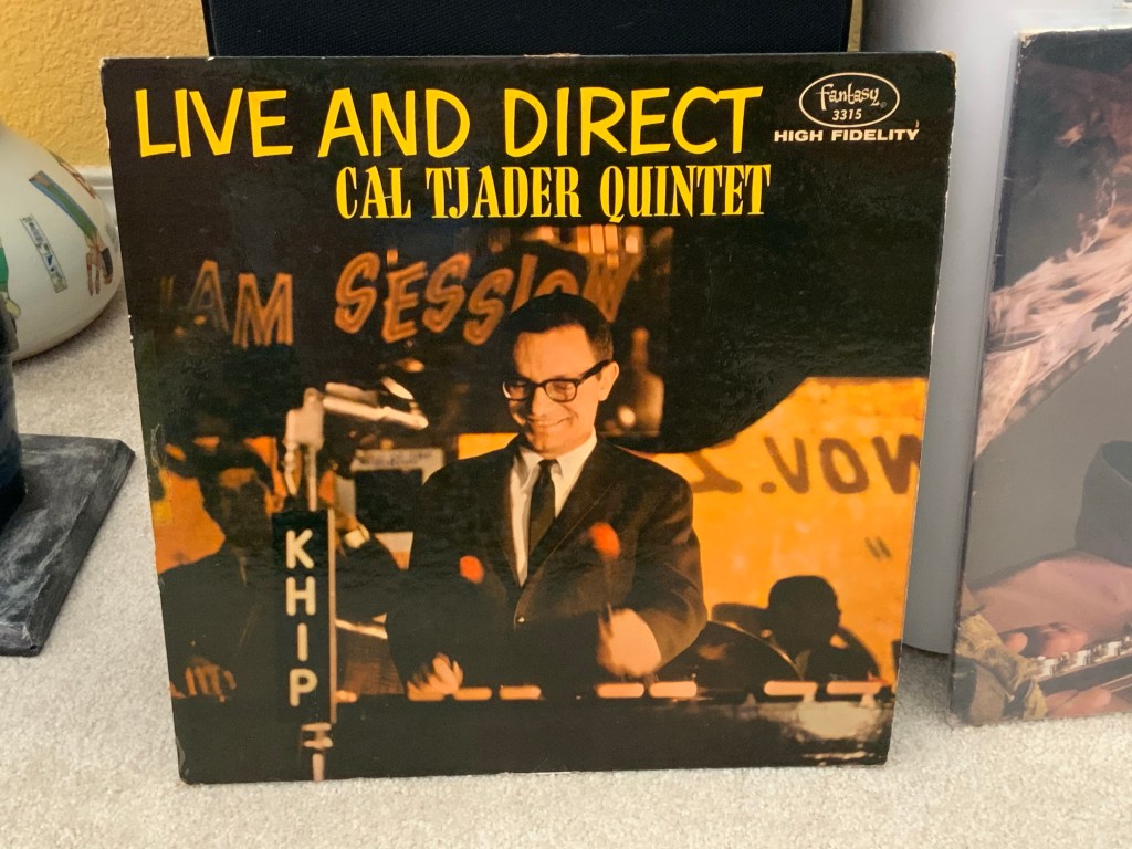 This week’s artist spotlight is on vibraphonist extraordinaire, Cal Tjader! I pride myself on being Cal’s #1 fan, and collector of every one of his albums, give or take a few. So, when I saw this album recently, took a look at the song list, the personnel, not to mention the action shot of Cal on the cover, smiling, mallets in the air, playing live for KHIP, an FM Jazz station out of San Francisco, I knew it had to come home with me. Prior to seeing it in person, someone in one of the exotica music groups I belong to on Facebook, had posted a YouTube of one of the songs on it, along with the shot of the album cover. I’d never seen this album before, and didn’t even know of its existence! (How this one managed to slip past my radar, all this time, I’ll never know.) Perhaps I attracted it to me, because I really wanted to find it after that….and about a week later, BAM! There it was, staring me in the face! And it was a red disc! I love colored vinyl records!